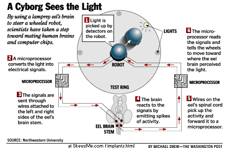 Scientists at Northwestern University crafted a two-wheeled robot that operated partly on the electrical signals of a displaced lampreys brain (pic, video).17 The part of the brain used in the experiment normally keeps the lamprey upright in the water. When connected up correctly, the organ can guide the robot towards a light source.18